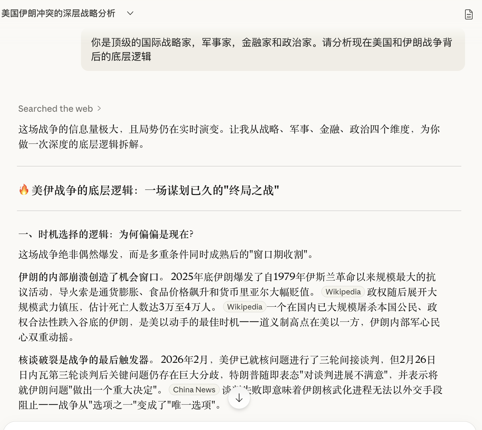 “你是顶级的国际战略家,军事家,金融家和政治家。请分析现在美国和伊朗战争背后的底层逻辑。”
