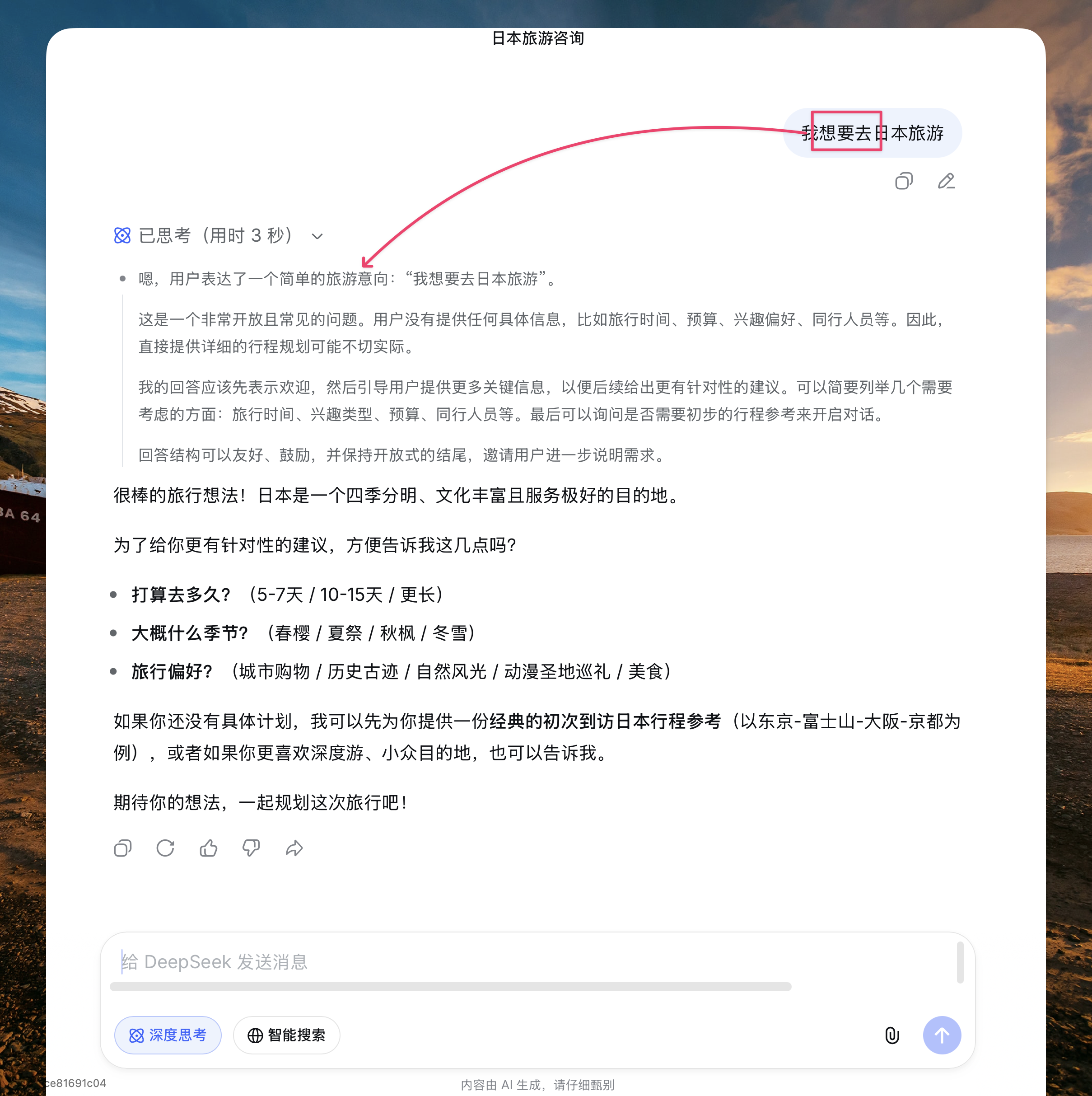 ChatGPT 会先判断你第一次去日本吗?有护照吗?然后才给行程意见,这是结构优先。DeepSeek 则是”接下来你想怎么做?”,这是情绪优先。前者在你需要时像导航,后者在你迷茫时像聊天。