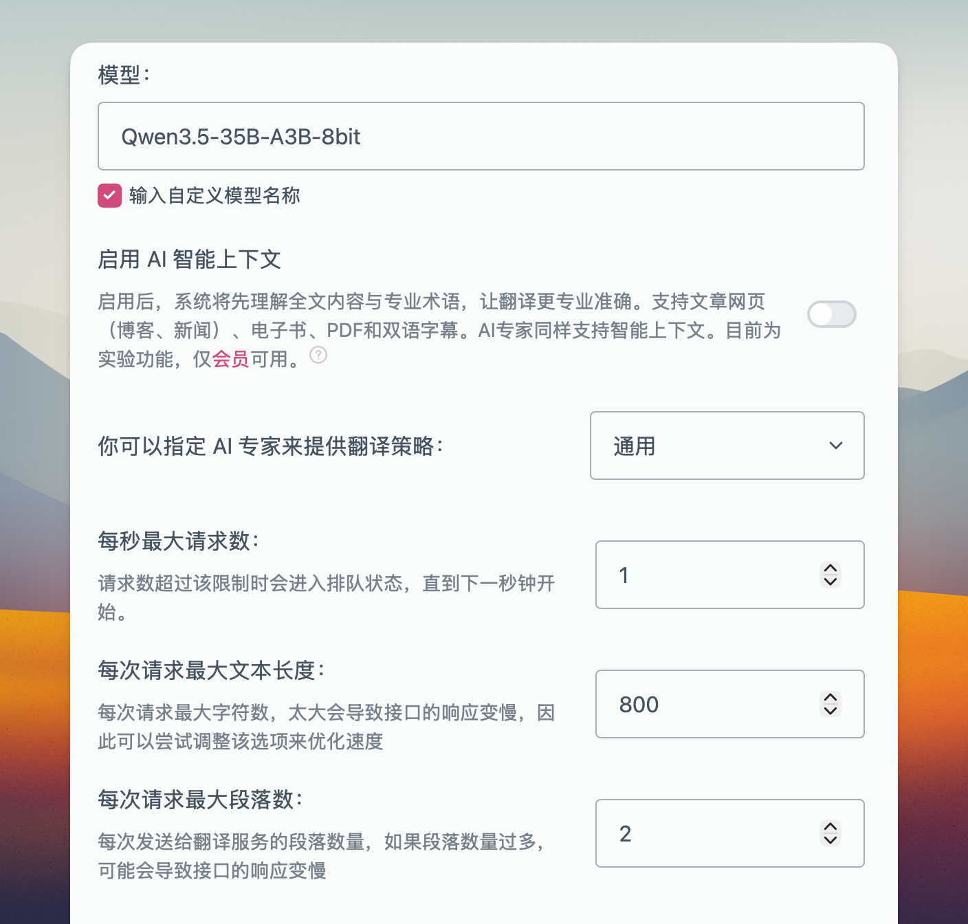 一开始修改 oMLX 的模型配置时发现有问题,后来调整了几次“沉浸式翻译”的相关配置,就解决了这个问题。我把这个经验分享出来,等后续有人通过搜索找到这篇内容的时候,要是按这个方法解决了问题,麻烦在这里留个言哈。