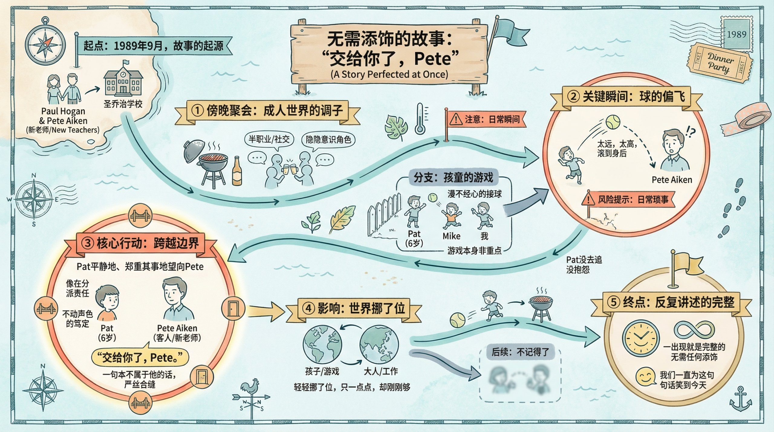 不是什么正经游戏。只是随手扔来扔去,松松散散,漫不经心——孩子玩的时候常常这样,游戏本身反倒不是重点。玩着玩着,不是 Mike 就是我扔坏了一球。球从 Pat 身边偏飞了出去——太远,也太高——然后从他身后滚了过去。