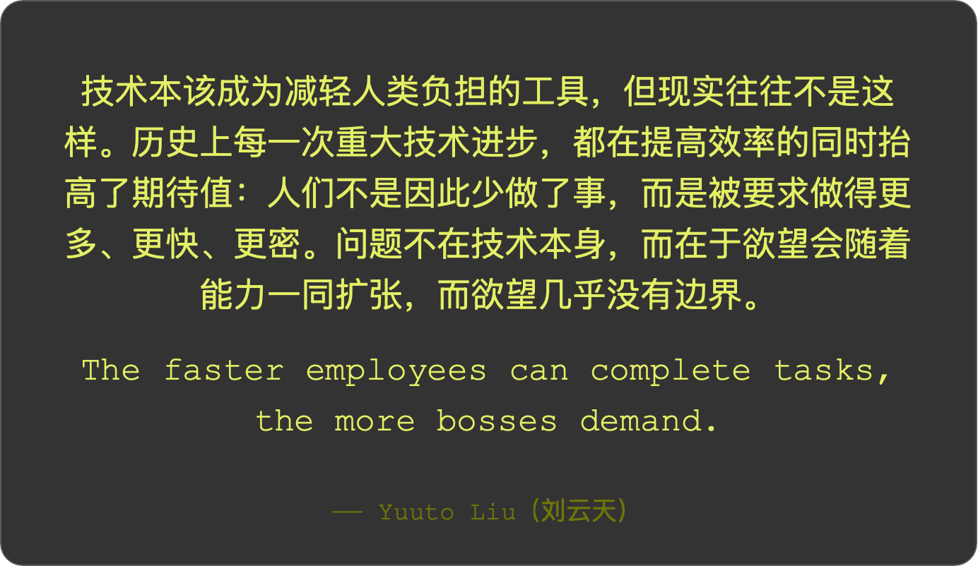 技术本该成为减轻人类负担的工具,但现实往往不是这 样。历史上每一次重大技术进步,都在提高效率的同时抬 高了期待值:人们不是因此少做了事,而是被要求做得更 多、更快、更密。问题不在技术本身,而在于欲望会随着 能力一同扩张,而欲望几乎没有边界。 The faster employees can complete tasks, the more bosses demand.